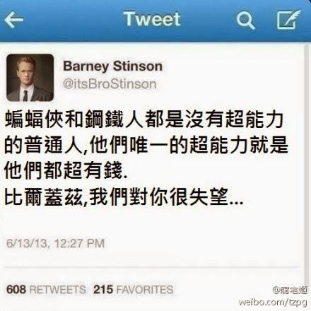 [分享] 跟蝙蝠俠、鋼鐵人相比,比爾蓋茲躺著也中槍阿! 科技 · show · 發表於 2013-12-30 10:24 · · 檢舉 列印版 twitter plurk 1.3萬閱讀次數 來源:http://tw.weibo.com/tzpg 5 個人說讚 收藏 快速回應 引言回應 登入來回應 header home