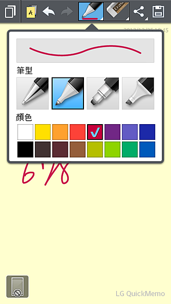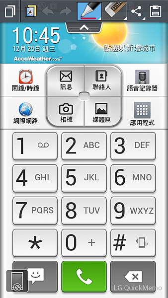 QuickMemo是LG招牌的筆記軟體之一,只要按下機身的快捷鍵即可開啟,非常簡單好用!默認的筆記本背景是擷圖畫面,當然也能自己設定為黃色底色。支援覆蓋模式,可以在筆記顯示在螢幕的狀況下,同時執行其他工作。