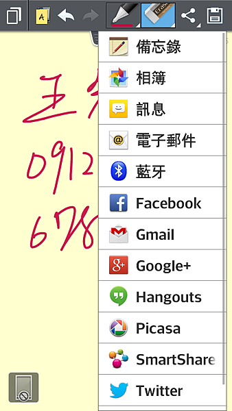 筆刷、顏色等可以自由更改。QuickMemo最適合隨手記下聯絡人或電話等資訊,可以先記下來,等事後在慢慢輸入到聯絡人中。