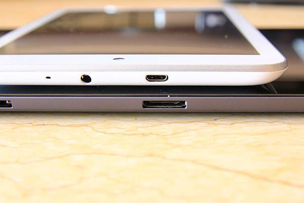 充電孔分別為MicroUSB規格和華碩自家的充電孔,論方便性當然是MicroUSB更勝一籌,線材幾乎唾手可得;然而華碩的自家接口提供較快的傳輸速度,在連接底座時,甚至有USB3.0的傳輸實力。看來Memo7的MicroUSB更適合日常使用,而TF701的接口對於一些專業需求,如大量傳輸媒體檔案等等,則能有更快的速度。