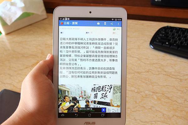 試閱了一些新聞軟體,如蘋果日報;結果發現字體的大小非常適合閱讀,圖片解析度也夠清晰。最重要的是一手就能輕鬆Hold住,另一隻手可以進行更加複雜的操作。8吋平板先天體積和重量上的優勢,展露無遺。