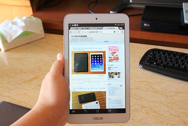 需要留言或是Po文時,鍵盤大小也極適合打字,兩隻手握著,用大拇指打字。不會像手機因為按鍵太小而誤觸,也不會像10吋平板,因為太寬,使得手指碰不到虛擬鍵盤中間的按鍵。
