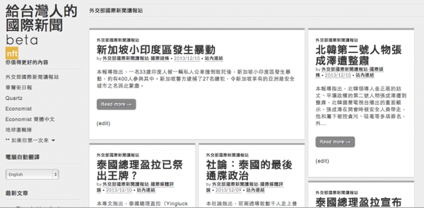 台灣政府媒體,綜合全球媒體,提供簡略翻譯與導讀,起始於 2012 年。發現這個網站的時候我其實挺驚訝的,喔,原來政府真的有在做事啊!如他自己的介紹,這個站是由前行政院新聞局楊永明局長於民國100年5月就任時提出想法,通過活用新聞局54 個駐外單位,每日蒐報上百則國際媒體所刊播有關台灣及重要國際時事議題的社(評)論及報導的資源,規劃、建置「國際新聞讀報站」網站,讓一般民眾也能利用新聞局提供的豐富資源,只要上一個網站就能綜覽國際重要大事。雖然文章內容有點流於報告形式(有點看得出來寫的人多是公務員),網站介面也老套的不能再老套了。但內容絕對是好貨,我個人非常推薦,對於快速了解國際大事非常有幫助。但我身邊好像沒人使用也沒人聽過,希望越來越多人能關注這個政府的德政,也督促他們做的更好。