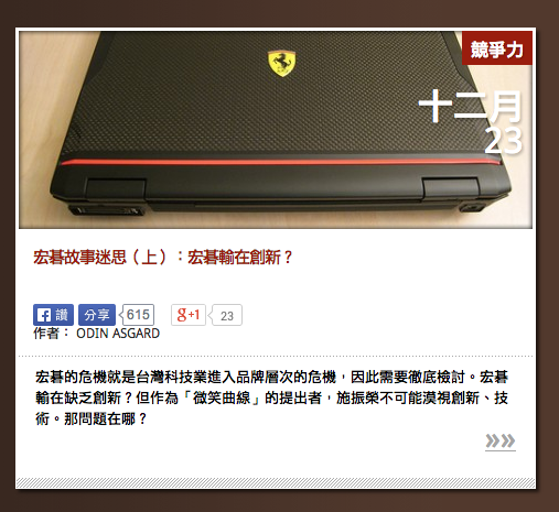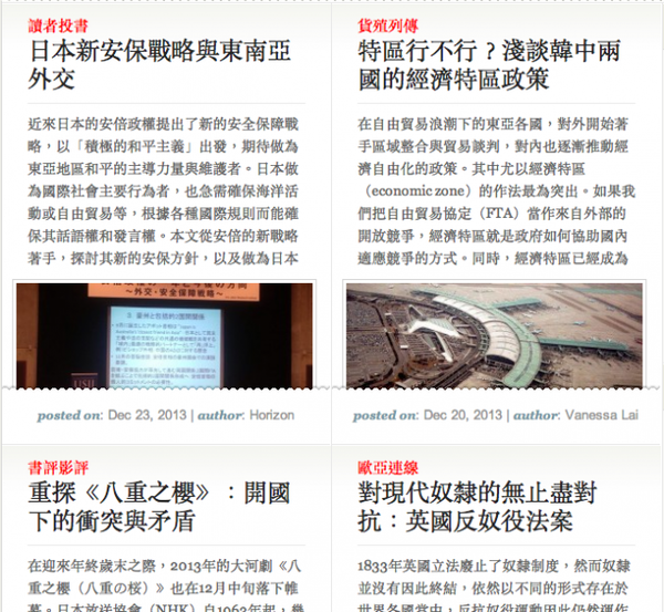 感謝網友分享,個人以為這個網站的內容真的做的很好,是比關鍵評論網聚焦的評論風格網站。十分開心這件事情早就有人在做,而且做的那麼好。我個人覺得介面不是太 modern,但內容非常好,可惜出刊速度有點慢。但明年初好像會有一個 2013 國際大事分析評論,應該會很精采。