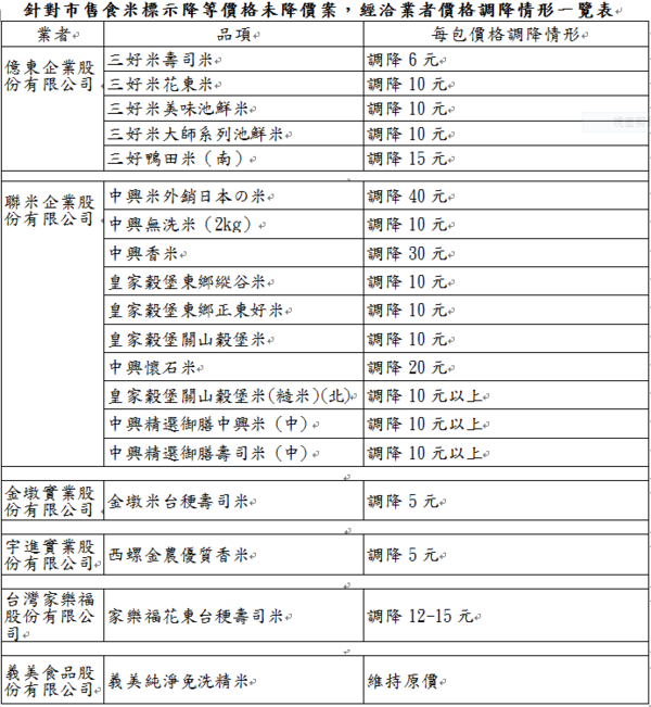 該署站在合理消費立場,與米穀公會、業者溝通,對於調降等級之品項,應提出合理的售價,經查計有億東企業股份有限公司、聯米企業股份有限公司、金墩實業股份有限公司、宇進實業股份有限公司及台灣家樂福股份有限公司共5家計18個品項配合降價,每包降價5-40元;另義美食品股份有限公司則表示,維持原價,詳如附件。對於降價品項部分,該署將再追蹤查核,至於未降價品項,除提供消費者參考外,將加強查核其品質。