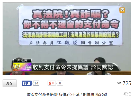 陳居亮說,支付命令核發條件寬鬆,以本案為例,詐騙集團向法院聲請時,只付上一張未曾寄出的存證信函佐證,要向黃姓婦人追討新台幣4990萬元。被害人以為是詐騙新招不理會,誰知過20日異議期,詐騙集團就向法院聲請扣押黃姓婦人財產。