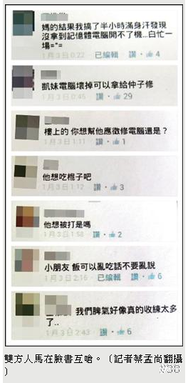 「樓上的,你想幫他應徵修電腦還是…」「他想吃棍子吧?」「他想被打是嗎?」「小朋友,飯可以亂吃話不能亂講…」「很行,再躲呀!」火藥味十足。