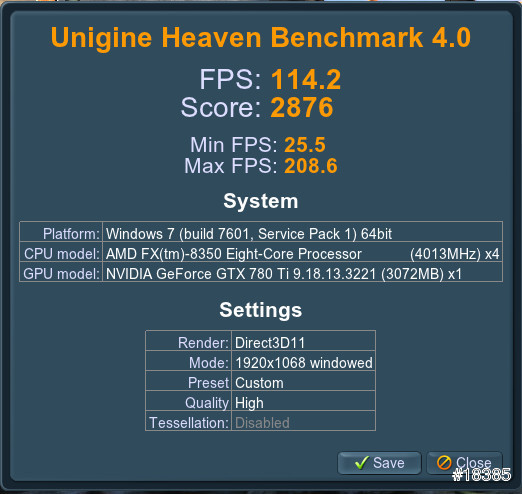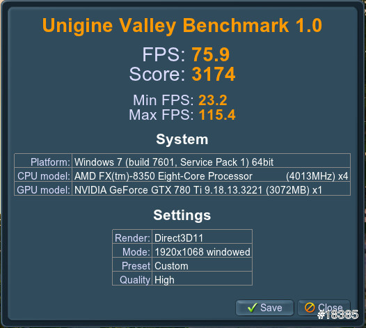 技嘉GTX780 Ti GHz版表現真的不錯,小弟臨時想不到有啥可以測看看的,就拿出之前看到版上有人跑NVIDIA的那支妖精,小弟記得以前玩過680SLI的樣子,但忘了跑多少,這次單張780Ti測,FULLHD下大約34張