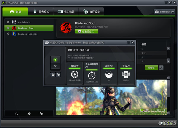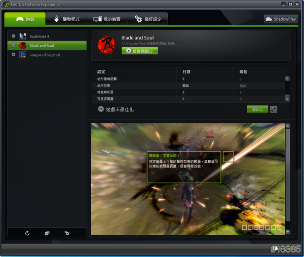 對了,近來玩遊戲都喜歡用NVIDIA新的Experience,還不錯用,反正一鍵就可以幫我把特效調好,另外就是用它的ShadowPlay無腦錄影功能,錄影時好像沒吃什麼資源,真的不錯~來推一個!!