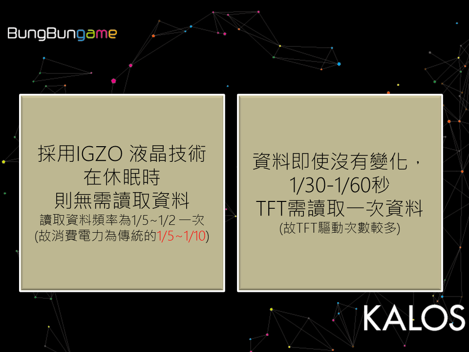 ▲ KALOS 搭載的 IGZO 面板,具有發色佳、低功耗省電、高感度觸控等優點。