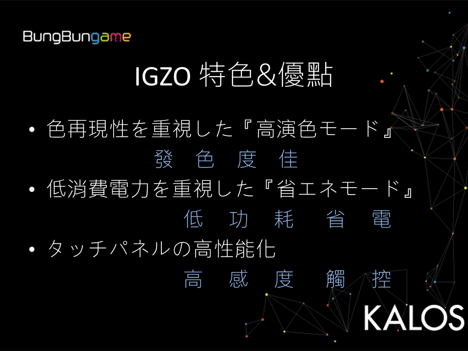 ▲ KALOS 搭載的 IGZO 面板,具有發色佳、低功耗省電、高感度觸控等優點。
