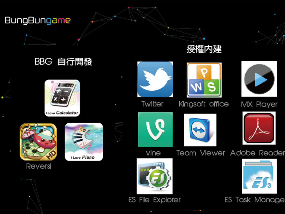 2013年5月於日本東京銀座成立第一個海外據點 BungBungame Japan Co.,Ltd.。同年6月於Computex展會發表全球首款解析度達2560×1600的10.1吋平板電腦「KALOS」。