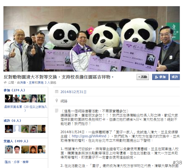 今天有一些新聞報導了清大校長頒與團圓、圓仔一家人的入學證書活動,馬上就有人在網路上舉辦一個「反對動物園清大不對等交換,支持校長擔任園區吉祥物。」的活動,從說明顯示舉辦者應該是對於清大校長的作法不滿而起的反制活動。