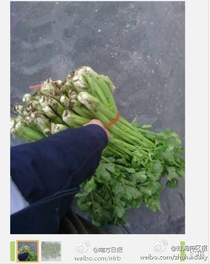 他在圖片表示「你們見過如此奇葩的年終獎嗎?兩大捆綠油油的芹菜,讓身在外地上班的孩子如何是好啊!」