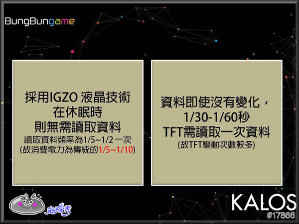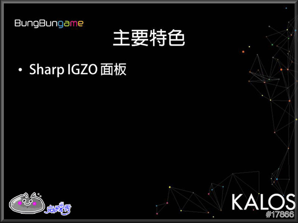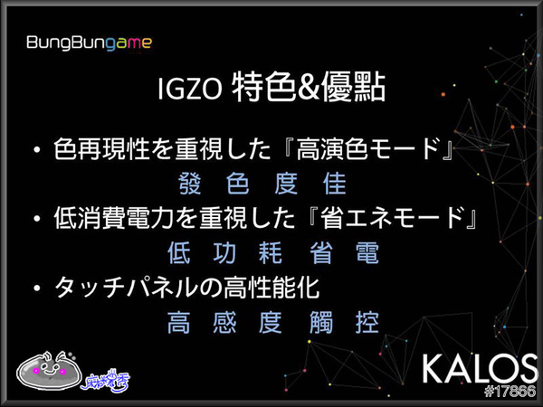 這個Sharp IGZO面板~好特別,之前很少聽到這個專有名詞,它的特色在是由四個元素結合而成的一個面板,也因為經由這四個元素的關係,可以讓螢幕有別於其他家的產品,省電,色彩鮮明,高感度而且在休眠時不用一直在讀取資料,更省電。讚哦!!