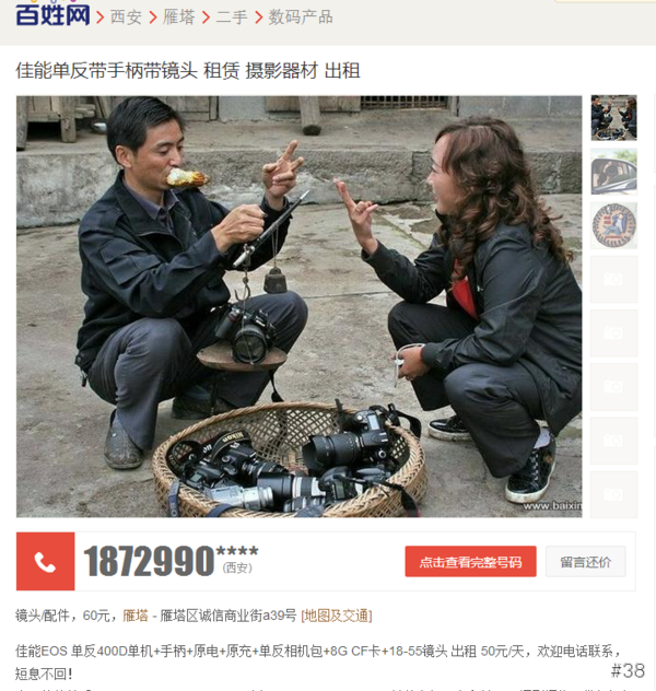 在中國的分類廣告網站上,有一間攝影器材出租的廣告特別吸引人,畫面中一位男士前面堆了一籮筐的相機,還在跟顧客論斤兩講價