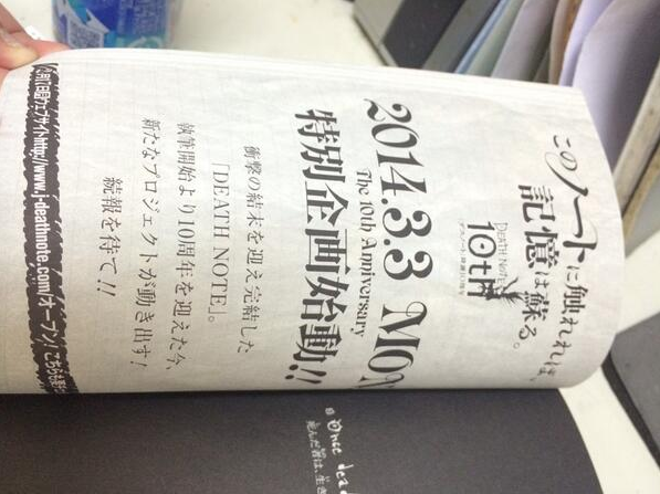死亡筆記本已經十週年了,最近官網悄悄的更新了新的訊息,看來是有新的動作要進行。 死亡筆記本自從2003年12月開始連載,一直到2006年5月結束。之前在發行的相關刊物上也曾經預告過在2014年3月3日會有「特別企劃」開始展開,這個特別企劃會是什麼呢?難道是有新的角色撿到死亡筆記本了嗎?就等到三月份來揭曉答案吧! 死亡筆記本官網:http://www.j-deathnote.com/ 讚 收藏 快速回應 引言回應
