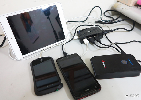 對了,買這行動電源還送一個4埠的USB HUB,後來才發現是一個4埠的USB充電盒,當初不知道,送給朋友了,結果他真是物盡其用的插滿滿 ^^”