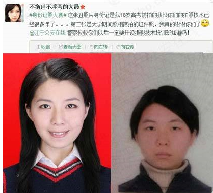 中國的證件照片拍攝方式與台灣不一樣,他們的照片都是由公安派出所、入出境管理局等官方機構拍攝的。因此某位大學生跟媒體表示:因身份證照片太醜,與本人差距很大,他考試時常被懷疑是“槍手”,總要跟監考老師解釋很久;春節坐飛機時,也被機場工作人員盯著看了很久才放行。“我想重新辦一張身份證,但又擔心還是會照得很醜。難道證件照片就不能照得好看一些嗎?”