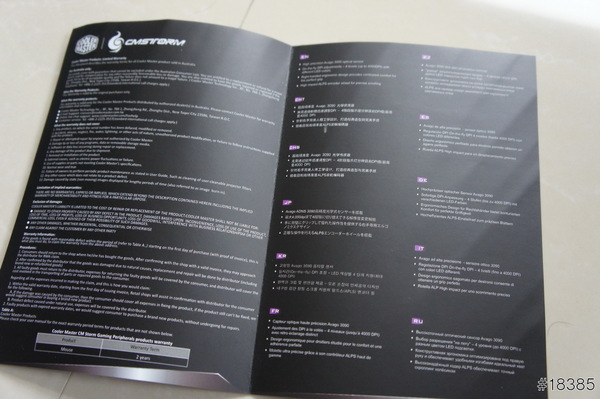 盒子裡頭啥都沒有只有一張多國語言的介紹說明,說這支滑鼠是Avago 3090的光學感應器,然後不需要軟體,可以直接快速調整DPI,還有四段指示燈,最後就是搭載著日製高精準度ALPS滾輪編碼器