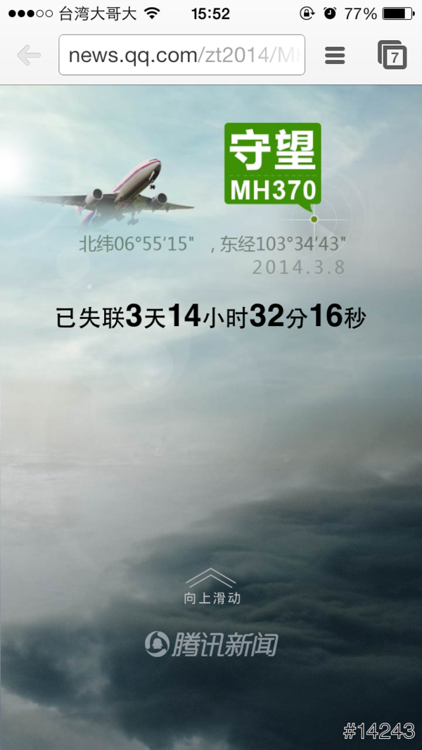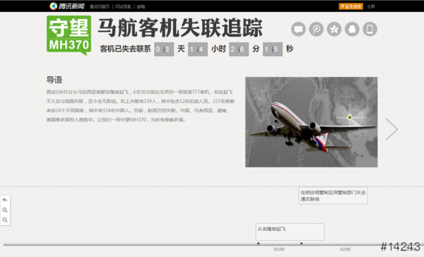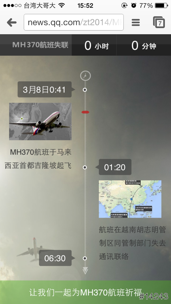 現代人打開手機、平板、電腦 充斥著滿滿的資訊等待你來吸收 有時候一則新聞炒了好多天 新聞下方的連結多到讓你搞不清楚究竟事情的發展到什麼地步了 或許也無法了解來龍去脈 最近看到一個網站整理馬航班機失聯事件的新聞重點呈現模式 覺得很不錯 跟大家分享一下 網頁版是利用滑鼠左右拖曳時間軸來查看 手機版本可以利用上下滑動的方式瀏覽時間軸 這種圖文懶人包對於不想看太多文字的人而言 可說是一種最快獲得資訊的好方法 當然如果需要知道詳細內容 還是需要花時間慢慢瀏覽每一則新聞報導囉!! 網站網址點這裡 讚 收藏 快速回應 引言回應