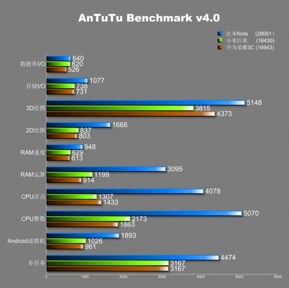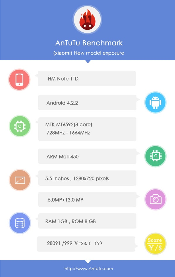 網友在安兔兔的數據庫發現了紅米Note的1G版本測試成績,完全符合小米之前公布的硬體規格。