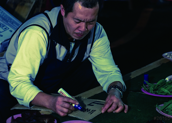 一位先生看著手中的錢,盤算著夠不夠買一盤填飽妻小的肉回去,