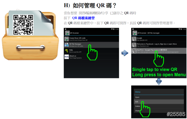 2. QR碼檔案總管:管理已儲存的QR碼 ( 檢視 / 編輯 / 刪除 / 分享 / 列印 )