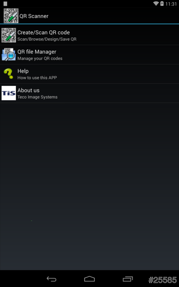 下圖為QR掃描器的主畫面。如圖所示,主畫面中有四個主選項,分別為掃描/建立QR碼、QR碼檔案總管、幫助說明、以及關於我們TIS。
