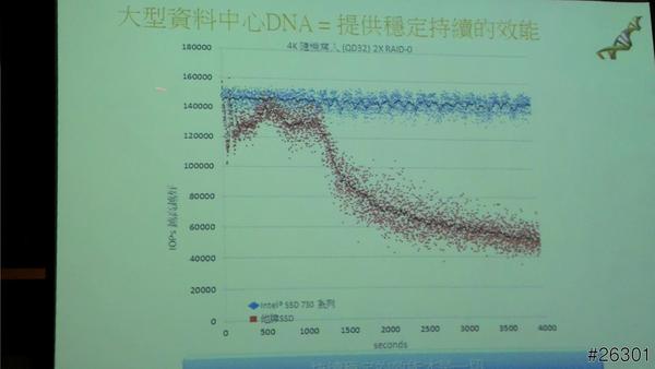由於K 版730 SSD的顆粒方便有精挑細選,所以穩定度方面一定優於他牌,在使用者在開機前1, 500秒,雙方效能都不相上下,在測試上 IOPs(每秒輸入/輸出運算)都相當高;但是過了1, 500秒後,他牌的IOPs明顯大幅下降,這也就是為什麼K版730 SSD能立於不敗的優勢。
