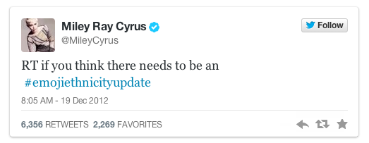 2012年12月時,Cyrus在tweet上發佈: 「RT (retweet; 轉推),如果你也覺得Emoji應該更新增加種族的多元性。」Cyrus要求Apple的Emoji表情符號要包括黑人以表示更加平等的社會。