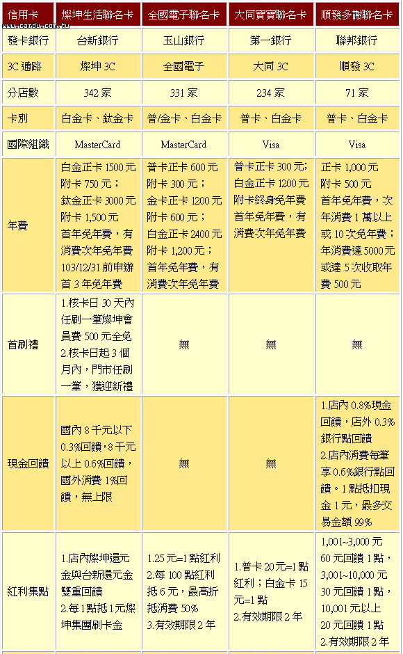 [情報] 4大3C聯名卡權益PK 燦坤、全國、大同、順發誰最好? 生活 · 23 · 發表於 2014-04-13 17:14 · · 檢舉 列印版 twitter plurk 5.0千閱讀次數 隨著科技發展,舉凡手機、平板、電腦…等3C商品,儼然成為生活必需品,而民眾主要的購買管道多集中在大型3C連鎖店。目前市面上與3C通路聯名的信用卡,除了日前發行的台新燦坤生活卡外,還包含聯邦順發聯名卡、玉山全國電子聯名卡及一銀大同寶寶聯名卡。 卡優新聞網整理了四大賣場的聯名卡相關資訊,新聞連結在此 以下是該網站整理的表格 讚 收藏 快速回應 引言回應 登入來回應 header home