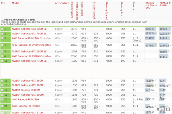 大家都知道筆電的顯示卡若與桌上型比,相同型號效能會差個40%左右,主要因為電力與散熱考量,因此在比較上,就採用目前市面上有推出的型號(未必有實際筆電搭載),從上圖來的排序,以P35W來看,搭載的870M除了小輸880M與780M比它高一階的產品外,其它比它強效能的多是雙卡模式,顯見確是玩家級的獨顯。