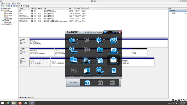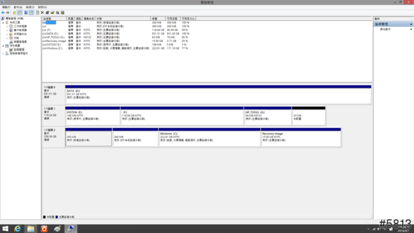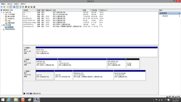 開啟硬碟管理後,就可以看到所有的儲存裝置。就上面簡介中有說,這台若把光碟機替換成儲存裝置後,可以有4個儲存裝置,但圖中只看到3台,主要是內建二台128GB的SSD,已經作成RAID0了,所以只看到3台,另一台是1TB的HDD,再來就是剛才放入的128GB的SSD了。官方有說,未來可以把四個儲存裝置作成各式的RAID,但目前尚未支援,待BIOS更新後即可。