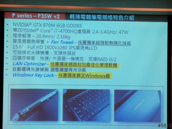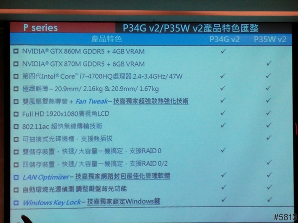 這次除了強調電競這個重點外,也破除了高端NB很大很重的錯覺,所以也強調輕薄。推出了二款產品,分別是14”的P34G與15.6”的P35W,都是第二代產品,所以標上V2,這次拿到試用的是P35W,所以以下特點就以此台為主。