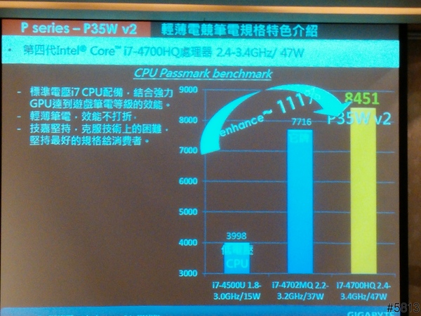 顯示卡重要,CPU當然也要頂規,第四代INTEL Core i7 4700HQ,也是目前頂規機種,多達四核八緒的能,所以跑分一樣漂亮,達到8451分