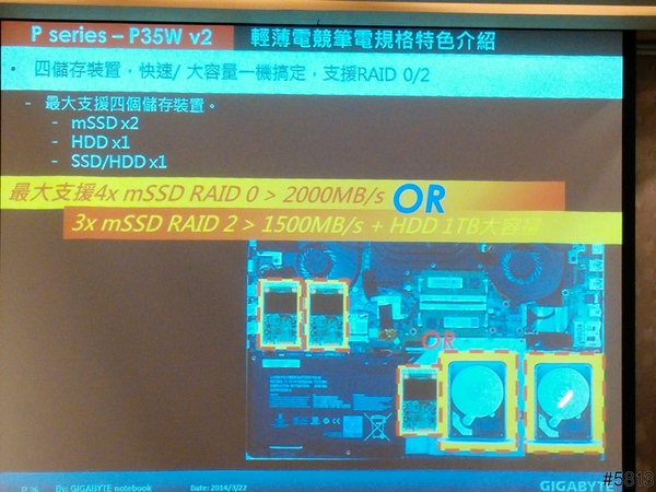 上面有提到光碟機槽可放儲存設備,其實P35W總共可有四個儲存裝置,還可組成RAID來加速。原廠提供2個128GB的SSD與1TB的HHD。