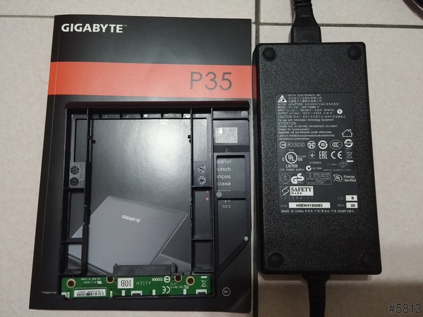 紙盒內是什麼呢?簡單的多國語言說明書與抽換式光碟槽專用的2.5”SSD支架,這部份上文介紹過,可再加裝一個2.5”的HDD或SSD,等下也會實際使用。另外,看到電源是台達電的,不過很大一顆,可能電競筆電的電量比較大。
