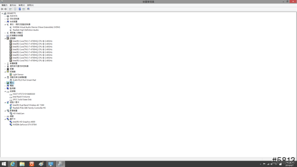 從裝置管理員中,可看到重要的規格,包括四核八緒的CPU、870M的顯卡、光源感測器、RAID0 SSD、1T HDD等。
