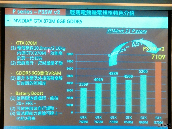 強調電競,顯示卡一定是很重要一環,P35W配備了目前最快的GPU之一的NVIDIA GTX870M,還用上了GDDR5 6GB,光看規格就知道超高階了,跑3DMARK11測試,也達到7109分