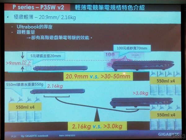 最後,來比較一下P34G與P35W二者差異。簡單來說,大致上相同,P34G因體積容量較小,所以顯卡稍低一階採GTX860M,儲存容量也減到2個,且沒有抽取式光碟機,但它的重要也低到只有1.67kg,所以想要更輕一點或是大尺寸更高效能機種,可自由選擇。