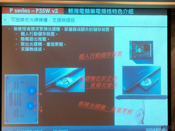 光碟機算是古董級的產品了,大多時用不到,但有時又一定要它,到底要不要放入筆電,是個難題,但現在有折衷方案了,採用抽取式,要用再把它裝進去,比外接式的方便多了,不用時可取出,可再減輕重量約500克,此外,此槽亦可放2.5”的9mm HDD或SSD,可再增加儲存容量