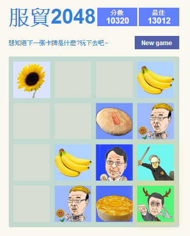 服貿2048只是把數字換成圖片而已,太陽花加太陽花變成香蕉,香蕉加香蕉變成香蕉毅,香蕉毅加香蕉毅變成太陽餅...至於最後的2048是什麼圖案先賣個關子!