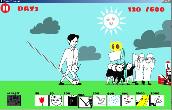 這個遊戲需至官網下載,玩家扮演總統府軍,對抗太陽花軍的攻勢,必須派出各種兵種擊退,並且在適當時機升級預算,捍衛總統府,一旦太陽花軍入侵總統府就宣告遊戲結束。小秘訣是按下暫停鍵略過冷卻時間,不過玩家是不是很想跟小編一樣故意輸掉呢?XD