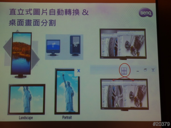 可智慧偵測螢幕方向並自行動態旋轉顯示內容,始終確保螢幕畫面正確顯示。當點擊桌面區域圖標時,所有視窗將平均分佈顯示於螢幕上。