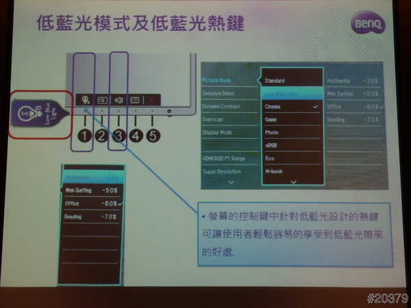 BenQ護眼液晶顯示器家族系列螢幕再進化,內建低藍光功能模式,可依使用情境開啟四種段數(30-70%)的低藍光呈現,有效過濾掉傷害眼睛的藍光,低藍光能有效保護雙眼,減少光波的刺激,減緩因藍光帶來的眼睛疲勞、酸澀與疲勞感,但讓影像保有真實動人的色彩表現。