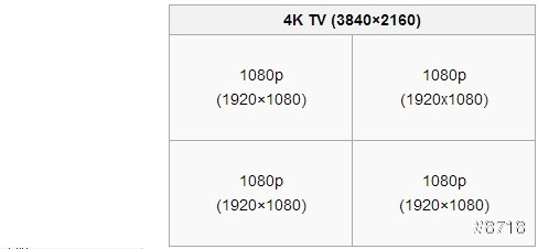 ▼首先簡單介紹4K和傳統FULL HD最大差異,下圖是一個4K螢幕,內含四個1920*1080(FULL HD)螢幕