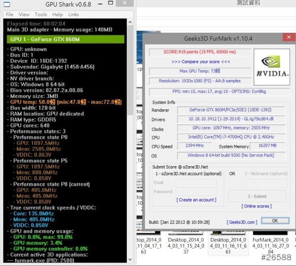 高階筆電最重要的部分之一,就是散熱。由於沒有測溫的儀器,筆者以msi afterburner最新版+AIDA64 3.00.2529 BETA 在25度的冷氣房中測試,其中的誤差還請注意。