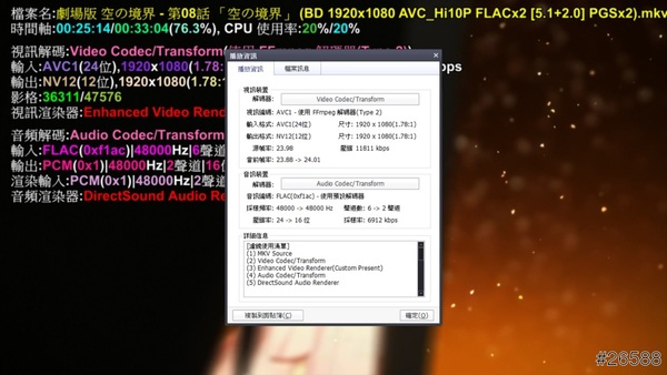 以Potplayer 1.5.32922版連續撥放 “劇場版 空之境界-第8話「空之境界」”,規格為BD 1920*1080 AVC_Hi10P FLAC*2[5.1+2.0] PSG*2.mkv,解碼器等設定採取內建解碼器。