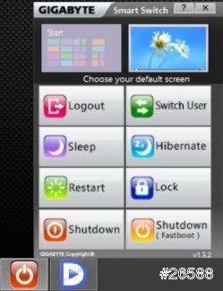 技嘉製作的電源選項紐,一目了然的大按鈕很實用。其相關功能可以讓不適應Win8/8.1的使用者有了一個簡單的操作方法,尤其是上方的設定起使畫面,可以設定開 機後要進入的桌面還是動態磚區。